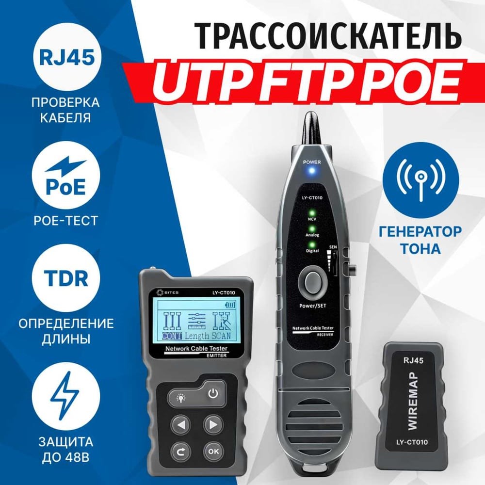 Многофункциональный тестер кабеля 5BITES LY-CT010 с ЖК-дисплеем предназначен для трассировки и проверки состояния сетевого кабеля и идентификации его статуса. Основные функции: Тестирование - UTP/STP кабеля для выявления различных неисправностей. Длина - измерение длинны кабеля локальной сети в диапазоне 2.5 ~ 120 метров. Сканирование - аналоговый / цифровой / PoE режимы для обнаружения кабелей локальной сети. PoE - доступно для стандартного или нестандартного источника (коммутатора, роутера) PoE (5-60 В), идентификация стандарта AT или AF. Порт FLASH - функция идентификации порта, к которому подключена одна из сторон кабеля, благодаря мигающей лампочке на коммутаторе / роутере. Технические характеристики: Типы тестируемого кабеля: CAT5e, CAT6, CAT6a (STP и UTP) Схема разводки с прямым подключением: Да Максимальное расстояние действия: 600 м Диапазон обнаружения длинны кабеля: 2.5 ~ 120 м Погрешность замера длинны: ±1.6 м Установление местонахождения обрыва: Да Диапазон тестирования PoE: DC 5~60B, стандартный / нестандартный (Passive PoE) Отображение напряжения PoE: Да Определяемые стандарты PoE: стандарт (802.3af/at) / не стандарт Защита по напряжению: DC 48В /5мА ЖК-экран: 128х64 мм, с подсветкой Питание передатчика: от батареек типа 1.5В ААА * 3 шт. (в комплект не входят) Максимальный рабочий ток передатчика: <150 мА Питание приемника: питание от батареи 9В Krone * 1 шт. (в комплект не входит) Максимальный рабочий ток приемника: <100 мА Ответная часть: порт RJ45