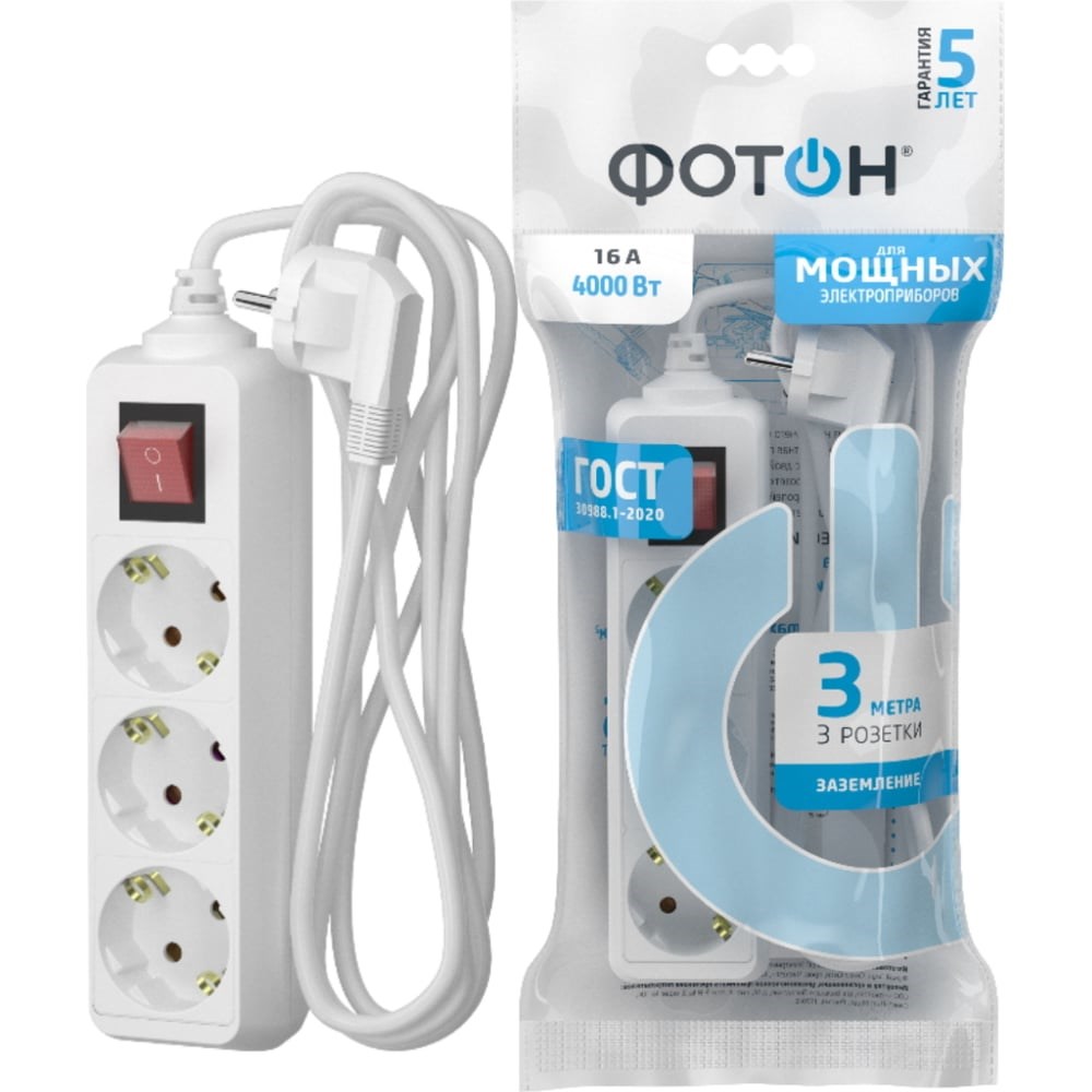 Удлинители C ЗАЗЕМЛЕНИЕМ рассчитаны на одновременное подключение приборов суммарной мощностью до 4000 Вт (номинальный ток - 16А). Они снабжены защитными шторками, прикрывающими контакты, для обеспечения дополнительной безопасности. Провод 3х1,0мм (квадратных) - сечение проводника 1,0 мм (квадратных).Латунная контактная группа обеспечивает высокую электропроводность и максимально плотный контакт со штырями вилки подключаемых приборов. Корпус изготовлен из термоустойчивого и ударопрочного ABS-пластика. Все удлинители ФОТОН предназначены для подключения к розеткам европейского стандарта.* Отсутствие искрения* Электро- пожаробезопасностьВыключатель на корпусе удлинителя позволяет обесточивать все разъемы удлинителя одним нажатием кнопки. Защитный бортик высотой 12 мм исключает риски поражения электрическим током при случайном попадании пальца в зазор между вилкой и гнездовым разъемом.Вся продукция полностью соответствуют нормам российского ГОСТ и EAC.