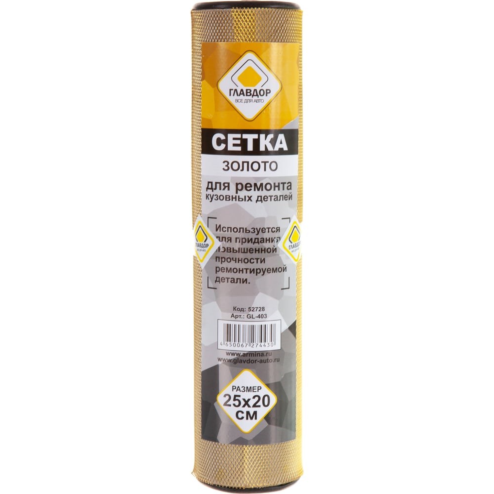 Сетка для ремонта кузовных деталей ГЛАВДОР GL-403 золото, 25х20 см/3 52728 предназначена для придания повышенной прочности ремонтируемой поверхности. Изделие быстро и равномерно нагревается, легко входит в пластик и не ржавеет. Модель имеет необходимую гибкость, упругость и прочность.