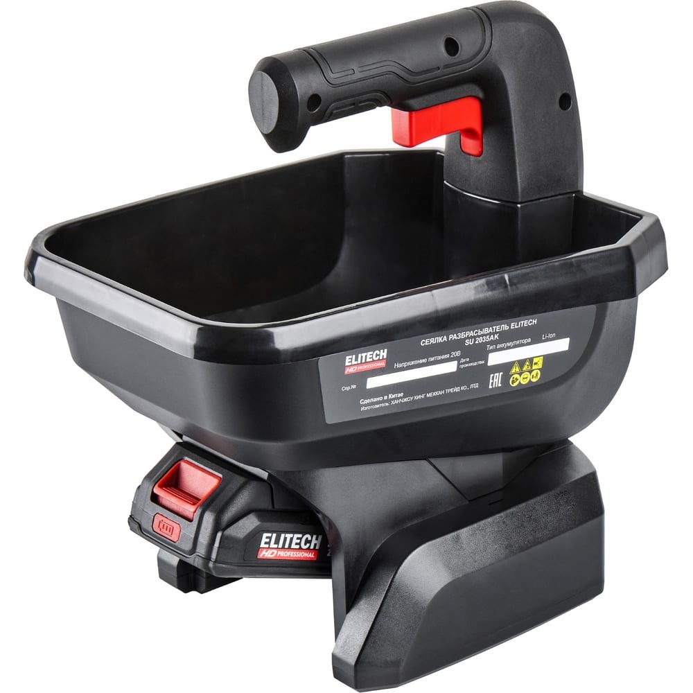 ELITECH «HD PROFESSIONAL» - серия инструментов для интенсивной работы, требующей высочайшей точности исполнения. Инструменты серии « HD PROFESSIONAL» сохраняют функциональность в экстремальных условиях окружающей среды. Они имеют максимальные степени защиты от перепадов температуры, влаги, пыли, перегрузок. Отличаются высокой ремонтопригодностью и высоким ресурсом. Созданы для профессионалов и для экстремальных условий.Аккумуляторная сеялка (разбрасыватель) ELITECH HD SU 2035AК с питанием от аккумулятора Li-ion 20 В предназначена для разбрасывания семян, крупных фракций удобрений, каменной соли и антиобледенителей на открытом воздухе с шириной разбрасывания 1,6-5 м. Оборудование не рекомендуется использовать для разбрасывания песка мелкой фракции и порошкообразных (мучных) удобрений.