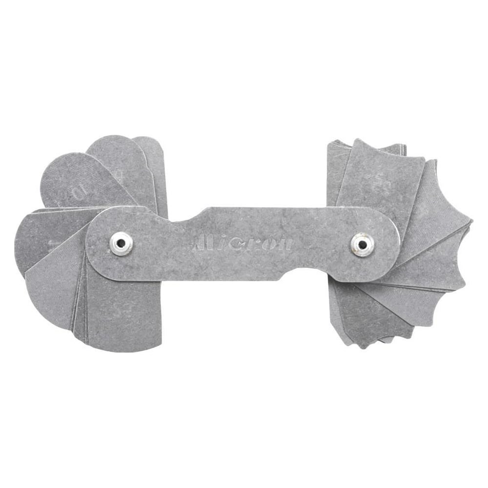 Радиусный шаблон Micron №3 МИК 46416 предназначен для выявления износа оборудования и для контроля радиусов выпуклых и вогнутых поверхностей. Инструмент позволяет осуществить измерение методом подбора подходящего щупа и прикладыванием к поверхности. Пластины шаблона выполнены из стали, имеют зубцы толщиной 1 мм.