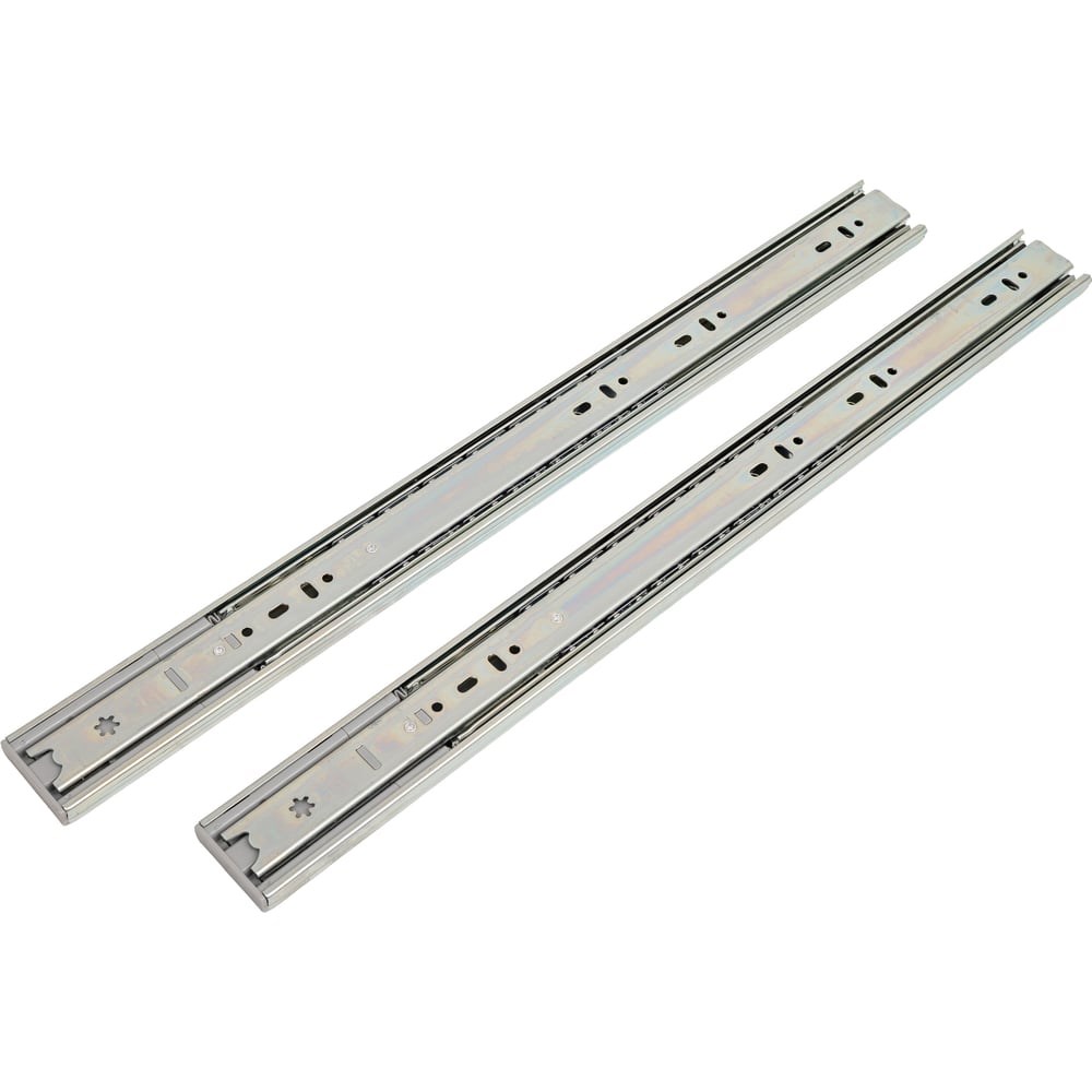 Направляющие шариковые с доводчиком полного выдвижения длиной 500 мм. Эти направляющие имеют толщину стали 1.5 мм и рассчитаны на нагрузку 35 кг. Их телескопический механизм обеспечивает полный доступ к пространству ящика а их ход мягкий и бесшумный. Система фиксации доводчика работает бесперебойно и имеет двойную защиту от случайного соскакивания. Ширина ящика не должна превышать 600 мм.