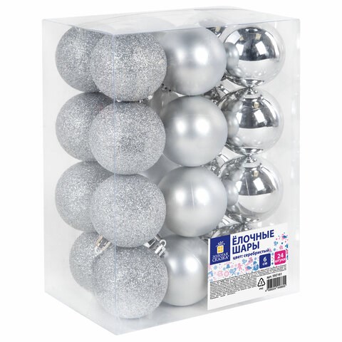 Шары ёлочные 24 шт., 6 см, "Trio", пластик, СЕРЕБРИСТЫЕ (глянец, матовый, глиттер), ЗОЛОТАЯ СКАЗКА, 592161