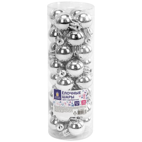 Шары ёлочные 32 шт., 2,5 см, "Tender Shine", пластик, серебристые, глянец, ЗОЛОТАЯ СКАЗКА, 592501