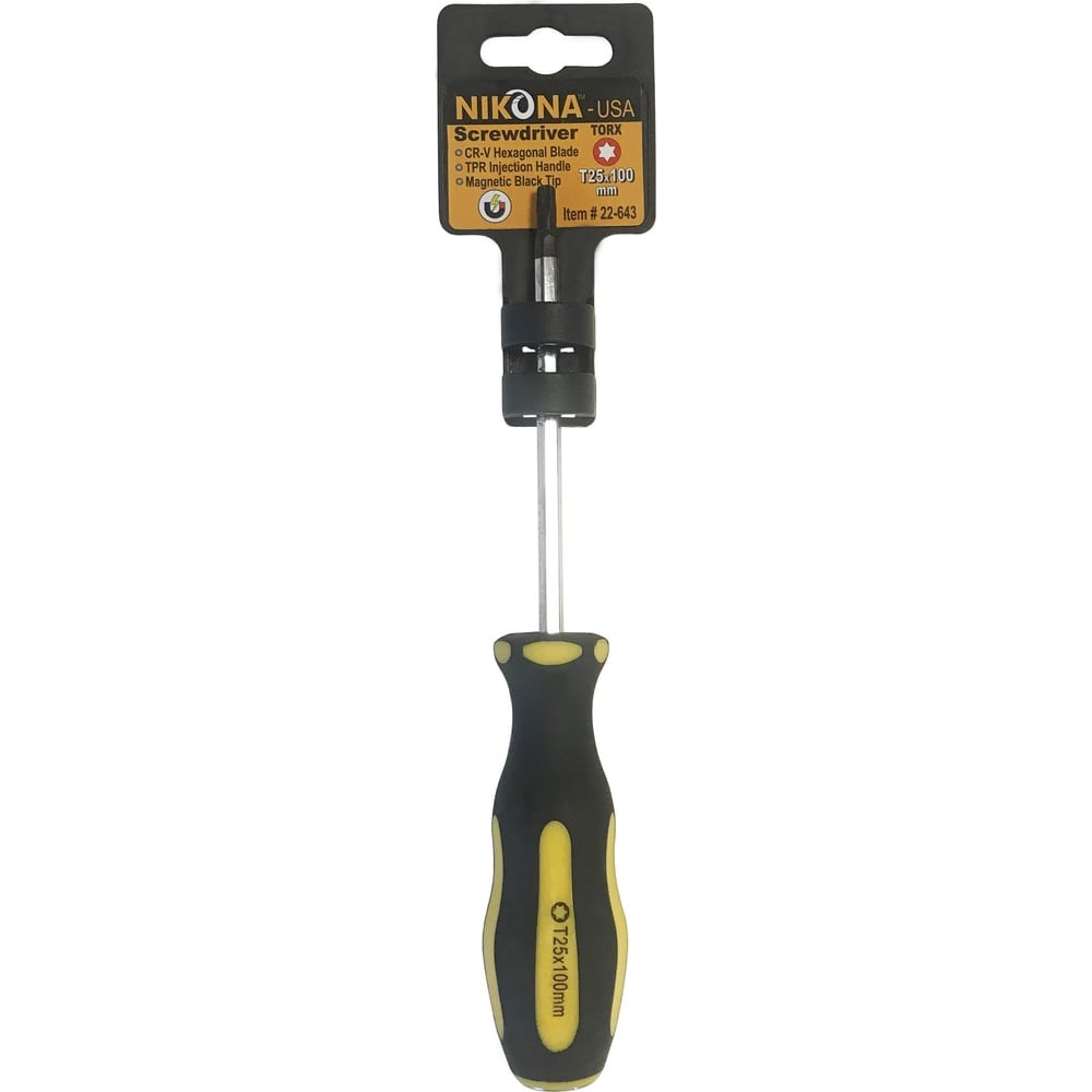 Отвертка NIKONA звездочка Torx Cr-V, T25x100 мм, шестигранная 22-643 предназначена для монтажных работ с резьбовым крепежом, имеющим звездообразный шлиц. Стержень по всей длине с резьбой для навинчивания шестигранной гайки, изготовлен из прочной хромованадиевой стали твердостью 48 HRC и имеет хромированное покрытие. Наконечник жала намагничен, индукционно закален и имеет фосфатированное покрытие. Эргономичная форма двухкомпонентной рукоятки из упругой резины TPR способствует созданию максимального крутящего момента и правильному распределению осевого усилия. Рукоятка не натирает кожу при работе, не скользит, устойчива к воздействию влаги и температурным перепадам.
