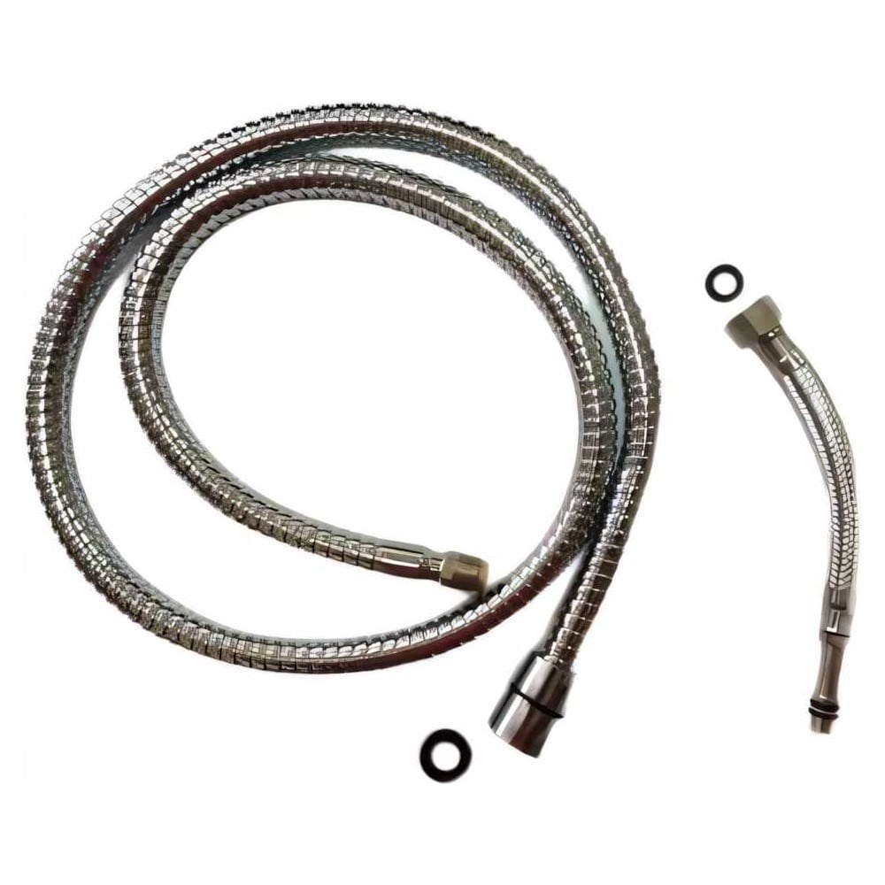 Шланг для кухонного смесителя с выдвижной лейкой предназначен для подачи воды из смесителя в выдвижную лейку и представляет собой гибкую полимерную трубку, помещенную в металлическую оплетку. Шланг для душа имеет металлические гайки с обеих сторон для стационарного крепления шланга к смесителю с одной стороны и выдвижной лейке с другой стороны. Комплектуется переходником размером 3/8". Материал изготовления – полимер и металл. Длина короткого шланга - 16 см, длина длинного шланга - 149 см.
