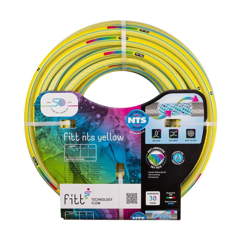 Шланг FITT NTS YELLOW 3/4", 25 м 3762487 - шланг для полива с оригинальным, необычным дизайном насыщенного желтого цвета. Состоит из шести слоев. Структура шланга: первый, внутренний слой желтого цвета; второй слой - черный, с добавками для предотвращения роста водорослей; следующий третий слой желтого цвета; четвертый слой - текстильное усиление NTS®; предпоследний пятый слой - это наружное прозрачное покрытие, шестой слой - пленка для защиты от УФ лучей SKY TECH® - предотвращает износ шланга и создает особую сатинированную поверхность. Срок службы: 30 лет.