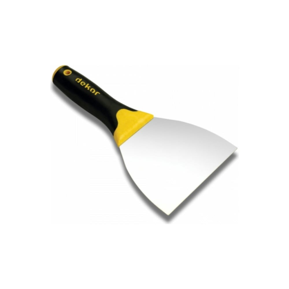 Шпатель нержавеющая сталь DEKOR 100 мм ручка с эластомерным покрытием 034 удобен в использовании. Прочный фиберглас надежно удерживает полотно. Использована гибкая сталь первого класса.