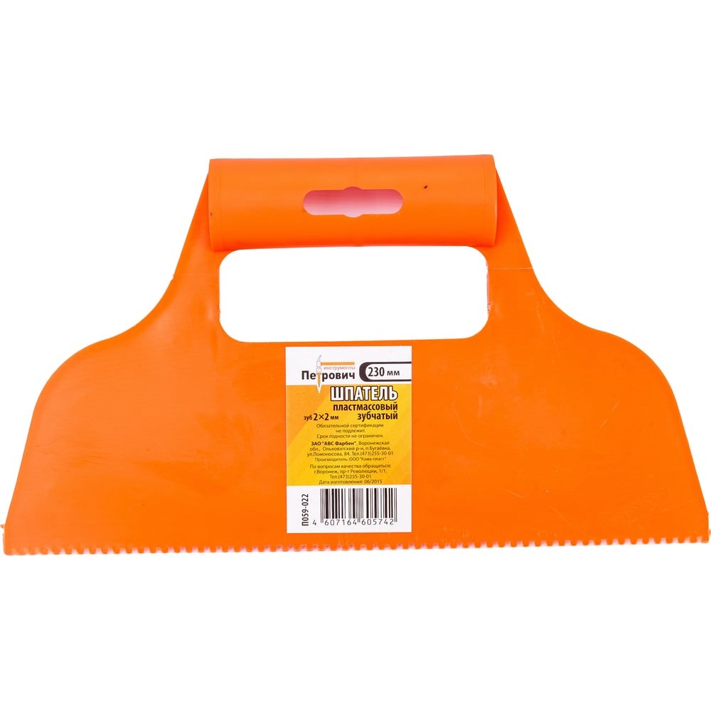Шпатель Петрович пластмассовый зубчатый, размер зуба 2*2мм П059-022 ПЕ 4100000499 необходим для работы с клеевыми смесями и различными составами. Имеет защиту от химического воздействия. Это позволяет работать с цементом без разрушения структуры металла вследствие воздействия кислот. Оснащен эргономичной рукояткой для удобства удержания.