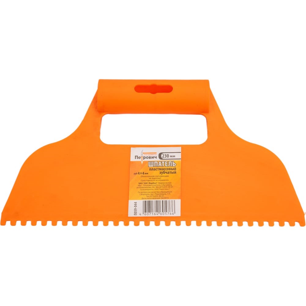 Шпатель Петрович пластмассовый зубчатый, размер зуба 4*4мм П059-044 ПЕ 4100000500 необходим для работы с клеевыми смесями и различными составами. Имеет защиту от химического воздействия. Это позволяет работать с цементом без разрушения структуры металла вследствие воздействия кислот. Оснащен эргономичной рукояткой для удобства удержания.