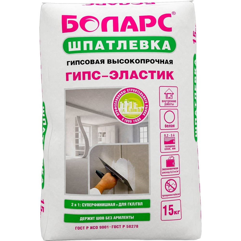 Шпатлевка БОЛАРС ГИПС-ЭЛАСТИК 15 кг 00000013731 - высокопрочная мелкофракционная гипсовая шпатлевка "2 в 1": суперфинишная + для заделки стыков ГКЛ, ГВЛ без армирующей ленты. Надежно держит шов до 5 мм без дополнительного армирования. Идеальна для финишной отделки стен и потолков внутри помещений с нормальной влажностью под последующую окраску и оклейку обоями. Рекомендована для заделки стыковых швов листов с полукруглой, скошенной и утоненной кромками без применения армирующей ленты. Может применяться для создания эффектных архитектурных элементов. Благодаря составу, материал сверхпластичный, легко шкурится и шлифуется. При заглаживании дает идеально гладкую шелковистую поверхность. Быстросохнущая, трещиностойкая. Наносится ручным способом на бетонные, газобетонные, оштукатуренные поверхности, ГКЛ, ГВЛ, ПГП.