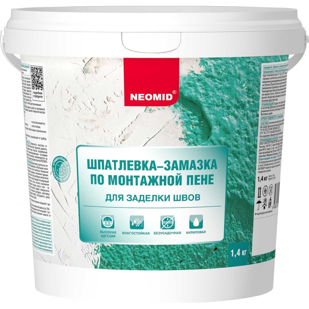 Шпатлевка по монтажной пене NEOMID 1,4 кг ЭЭ Н-Шпат-пена/1,4 безусадочная готовая к применению шпатлевка на акриловой основе предназначена для заделки швов по монтажной пене и других ремонтных работ снаружи и внутри помещений. Входящие в состав армирующие микроволокна позволяют заполнять полости глубиной до 10 см без растрескивания.