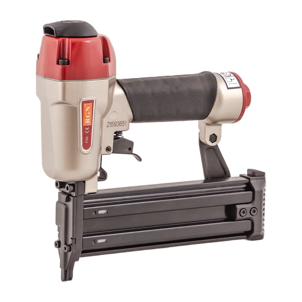 Штифтозабивной инструмент RGN F50R используется для быстрой и надежной "пристрелки" листовых материалов, таких как паркетная доска, фанера, ДВП, гипсокартон при выполнении следующих работ: изготовление мебели, изготовление дверей и окон из дерева, укладка паркета, обшивочные и отделочные работы. Инструмент отличается простотой и надежностью исполнения. Имеет алюминиевые корпус и магазин. Применяемые финишные гвозди для нейлера - Brads 12, 18GA, SK300, J, F, AX (AY), DN13. Сечение гальванизированной проволоки 1.0х1.25 мм. Ширина шляпки финишного (паркетного) гвоздя 1.9 мм.
