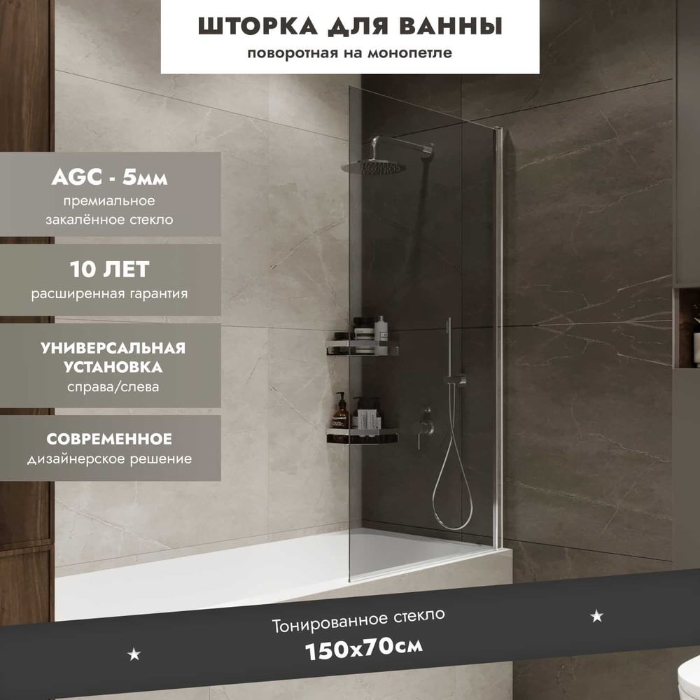 Шторка на ванну стеклянная 70x145 см поворотная, с профилем хромированного цвета и тонированным стеклом. Подходит к классическим прямоугольным ваннам любого производителя и устанавливается на борт.Благодаря выдержанному дизайну, интерьер станет более строгим. В производстве данного изделия используются материалы только высокого качества. Витраж из безопасного, ударопрочного, закаленного стекла AGC Premium 5 мм, марки М-1, П-образный профиль из анодированного алюминия.Шторка универсальной ориентации, перевернув на 180°, вы получите левый либо правый вариант установки. Крепится упором в стену и на борт ванны.Расширенная гарантия на изделие – 10 лет. Сертифицированный товар, соответствует Европейским стандартам.Изделие идет в жесткой упаковке, что позволяет максимально защитить груз во время перевозки. Обрешетка представляет собой деревянный каркас, сделанный по габаритам груза.