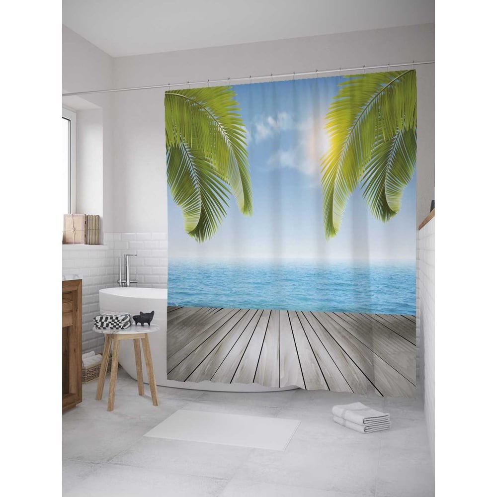 В отличие от подобных изделий из ПВХ и силикона, занавеска в ванную, пошитая из полиэстера, выгодно отличается красивым внешним видом, прочностью и длительным сроком службы. Водонепроницаемая ткань плотностью 80 г/м2 украшена стильным разноцветным принтом - нанесенная краска не боится контакта с горячей водой и не выцветает с течением времени. В комплект шторы для ванной размером 180х220 см входит 12 крючков, для которых уже подготовлены все нужные отверстия. Стиль: морской. Принт: Мост вдоль моря. Цвет: голубой, зеленый, серый. Рисунок: морская тематика. Теги: деревянные доски, пальмы, море, солнце. При покупке нужно учесть, что фактический размер изделия может отличаться от заявленного в пределах не более 5 см.