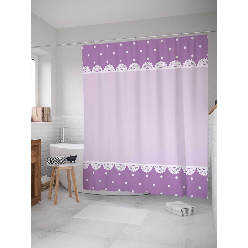 В отличие от подобных изделий из ПВХ и силикона, занавеска в ванную, пошитая из полиэстера, выгодно отличается красивым внешним видом, прочностью и длительным сроком службы. Водонепроницаемая ткань плотностью 80 г/м2 украшена стильным разноцветным принтом - нанесенная краска не боится контакта с горячей водой и не выцветает с течением времени. В комплект шторы для ванной размером 180х220 см входит 12 крючков, для которых уже подготовлены все нужные отверстия. Стиль: геометрический. Принт: Сокровенное счастье. Цвет: фиолетовый, темно-фиолетовый, белый. Рисунок: орнамент. Теги: полосы, точки, горошек, геометрический, симметрия, ритмический, ряд, орнамент, паттерн, текстура, повтор. При покупке нужно учесть, что фактический размер изделия может отличаться от заявленного в пределах не более 5 см.