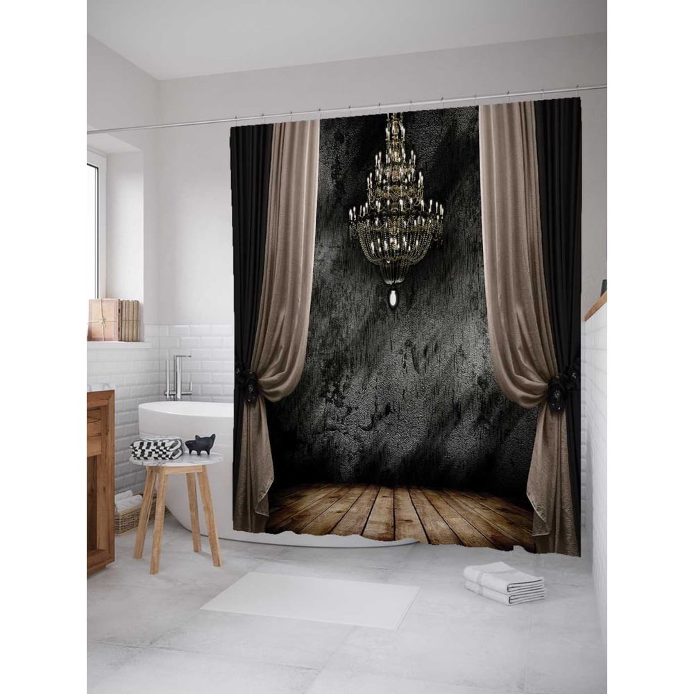 В отличие от подобных изделий из ПВХ и силикона, занавеска в ванную, пошитая из полиэстера, выгодно отличается красивым внешним видом, прочностью и длительным сроком службы. Водонепроницаемая ткань плотностью 80 г/м2 украшена стильным разноцветным принтом - нанесенная краска не боится контакта с горячей водой и не выцветает с течением времени. В комплект шторы для ванной размером 180х220 см входит 12 крючков, для которых уже подготовлены все нужные отверстия. Стиль: готика. Принт: Темная комната. Цвет: серый, черный, белый. Рисунок: сюжетный. Теги: шторы, люстра, комната, фантастика, фантазия, сказка, магия, фентези, фэнтези. При покупке нужно учесть, что фактический размер изделия может отличаться от заявленного в пределах не более 5 см.