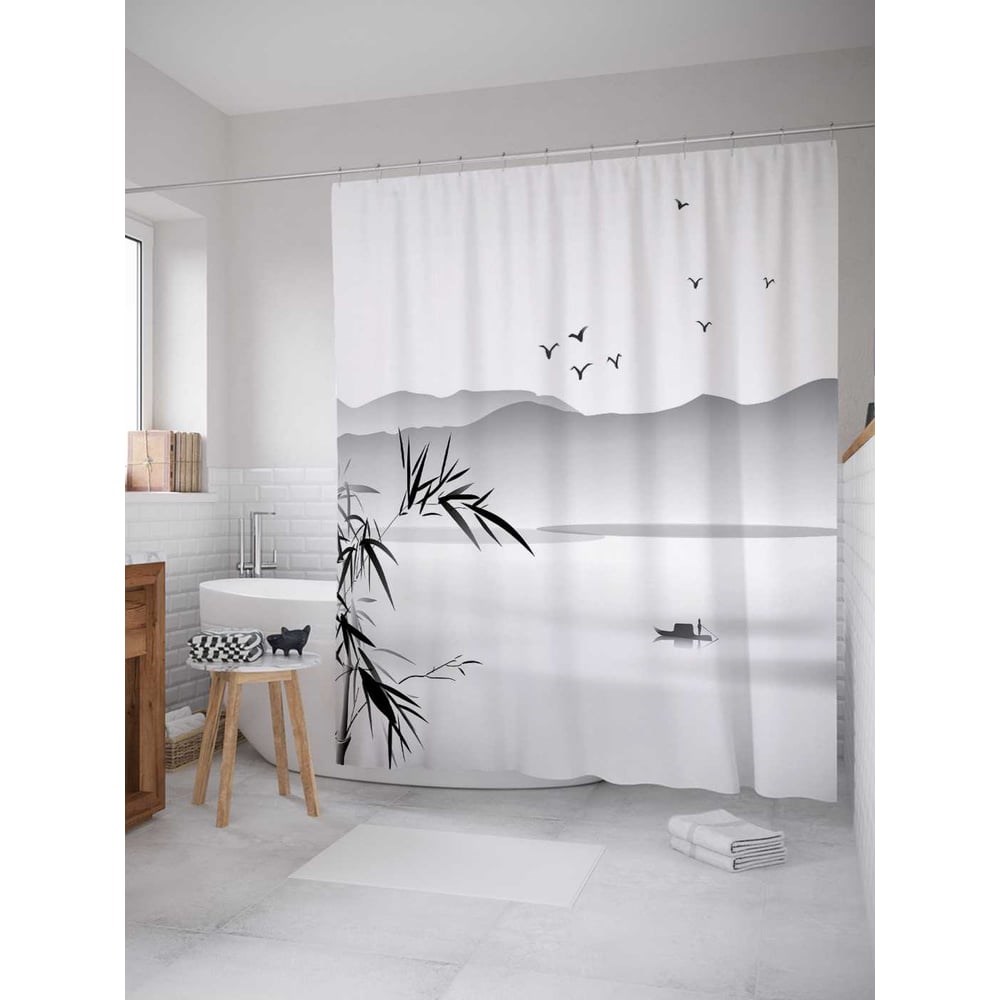 В отличие от подобных изделий из ПВХ и силикона, занавеска в ванную, пошитая из полиэстера, выгодно отличается красивым внешним видом, прочностью и длительным сроком службы. Водонепроницаемая ткань плотностью 80 г/м2 украшена стильным разноцветным принтом - нанесенная краска не боится контакта с горячей водой и не выцветает с течением времени. В комплект шторы для ванной размером 180х220 см входит 12 крючков, для которых уже подготовлены все нужные отверстия. Стиль: наив. Принт: Водное путешествие. Цвет: серый, белый. Рисунок: пейзаж. Теги: лодка, река, горы, рисунок. При покупке нужно учесть, что фактический размер изделия может отличаться от заявленного в пределах не более 5 см.
