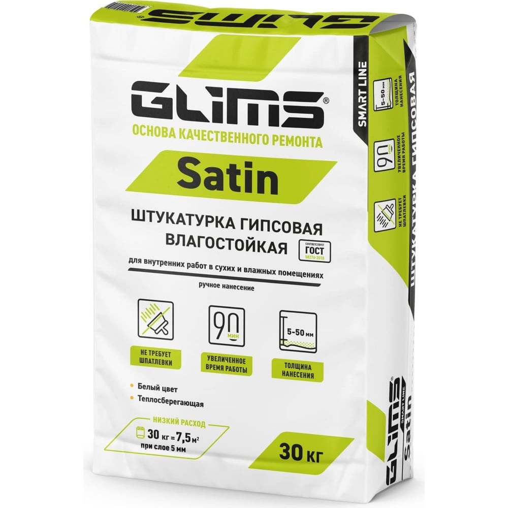 Штукатурка GLIMS SatiN 30 кг О00007220 - это штукатурная смесь для внутренних работ в сухих помещениях и помещениях с повышенной влажностью. Наносится на основания из пено- и газобетона, газосиликатные блоки, кладку из клинкерного, керамического и силикатного кирпича, поризованные керамические блоки, керамзитобетонные и полистиролбетонные блоки, а также на ранее оштукатуренные поверхности. Состав используют для высококачественного выравнивания стен и потолков под оклейку обоями, покраску и другие виды финишных покрытий в сухих и влажных помещениях, а также для изготовления декоративных элементов.