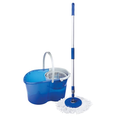 В набор входят: ведро с системой отжима, швабра с круглой насадкой из микрофибры и запасная насадка. Отжим осуществляется нажатием ручки по направлению вниз. Круглая платформа, на которой крепится МОП, вращается относительно оси ручки, что позволяет производить уборку в труднодоступных местах (например, под мебелью). Отжим - центрифуга, приводящаяся в действие нажатием на ручку швабры. Объем ведра из пластика - 14/5 л. Рукоятка телескопическая, позволяет подобрать наиболее удобную длину. Моющий элемент МОПа из микрофибрs чистит без моющих средств. Комплект выполнен в синем цвете.