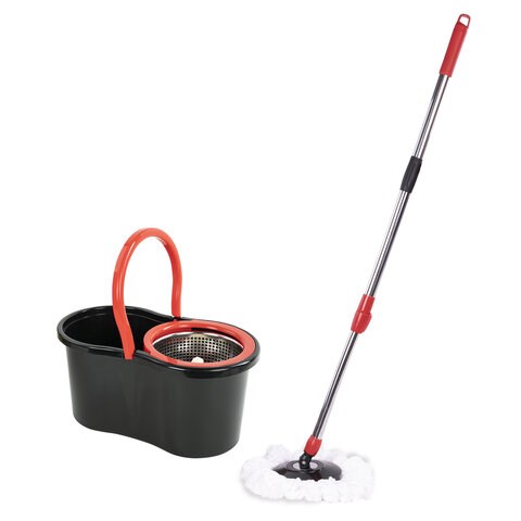 В набор входят: ведро с системой отжима, швабра с круглой насадкой из микрофибры и запасная насадка.