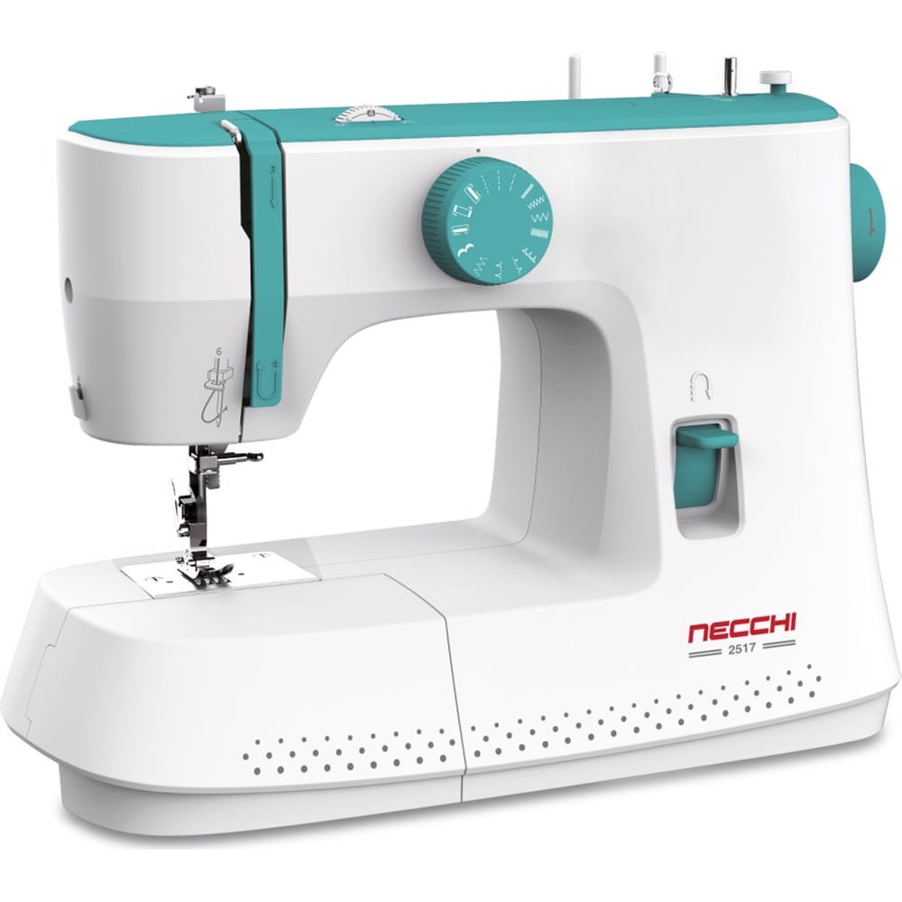Швейная машина Necchi 2517 входит в новую серию швейных машинок итальянской компании Necchi. Электромеханическое управление, 17 операций, полуавтоматическое изготовление петли под пуговицу. При распаковке моментально понимаешь, что перед тобой современная и очень качественная техника. Отточенная новая форма, изумительные цвета корпуса, сочетание нежно белого и мятного (цвет Тиффани), сама поверхность приятного матового исполнения. Дополнительный положительный момент – отсутствие неприятных запахов от пластика. По конструкции, это классическая несущая рама из металла с железным челночным устройством самого долговечного вертикального типа. Двигатель мощностью 70 Ватт, шестиполосная зубчатая рейка и полностью стальной лапкодержатель. Само собой, присутствуют и клавиша реверса и сдвижной столик для функции свободного рукава и, установленный прямо на корпусе нитеобрезчик. Ширина и длина строчек не меняется, что однозначно позволяет рекомендовать эту машинку для начинающих пользователей и юных особ. В этом контексте это скорее достоинство модели. Во-первых, надежность механизма, не отягощенного лишними регулировками, а во-вторых, отсутствие необходимости настроек параметров стежка. В данной новинке очень удачно получилось поймать такой баланс функций и возможностей, что простая конструкция и минимальный комплект строчек никак не ограничивают и дальнейшее использование, уже после освоения начальных навыков, для полноценного шитья вещей.