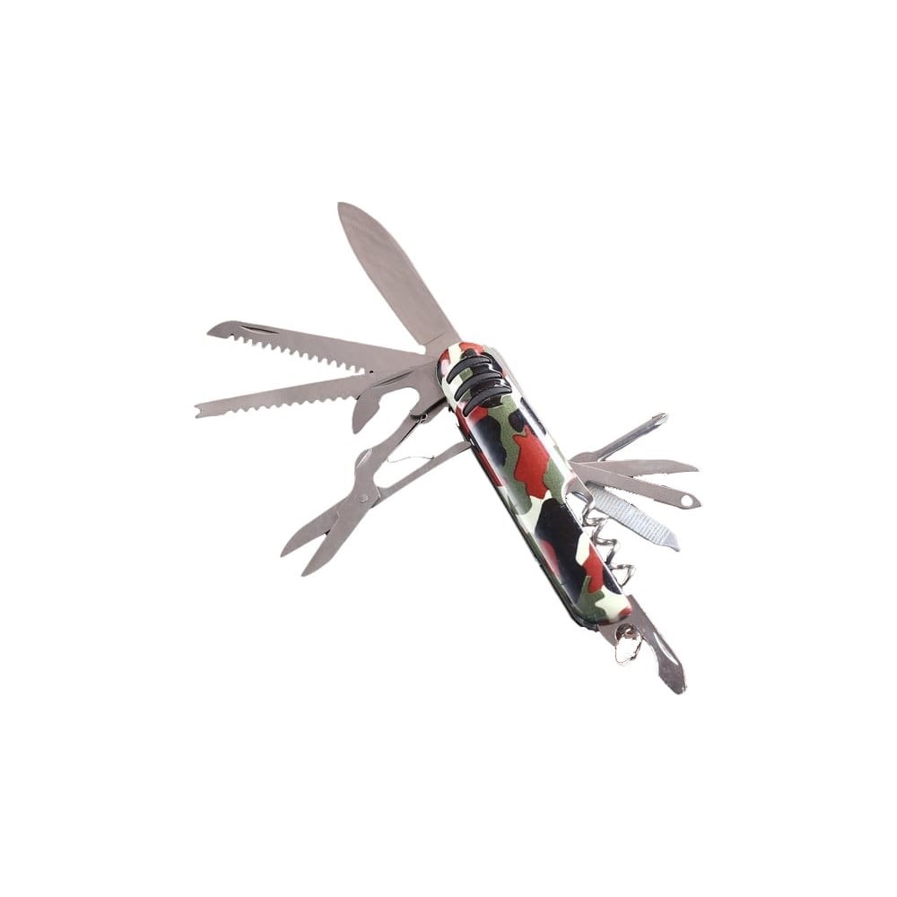 Швейцарский нож Мастер К Солдатский 11 функций, рукоять цветной камуфляж 659130 подходит для использования в походе, на пикнике. Инструменты изготовлены из прочной и качественной стали, что обеспечивает долгий срок службы. Все рабочие элементы складываются в рукоятку, что гарантирует безопасность во время хранения и транспортировки. Предусмотрено специально кольцо для подвешивания на ключ или рюкзак.
