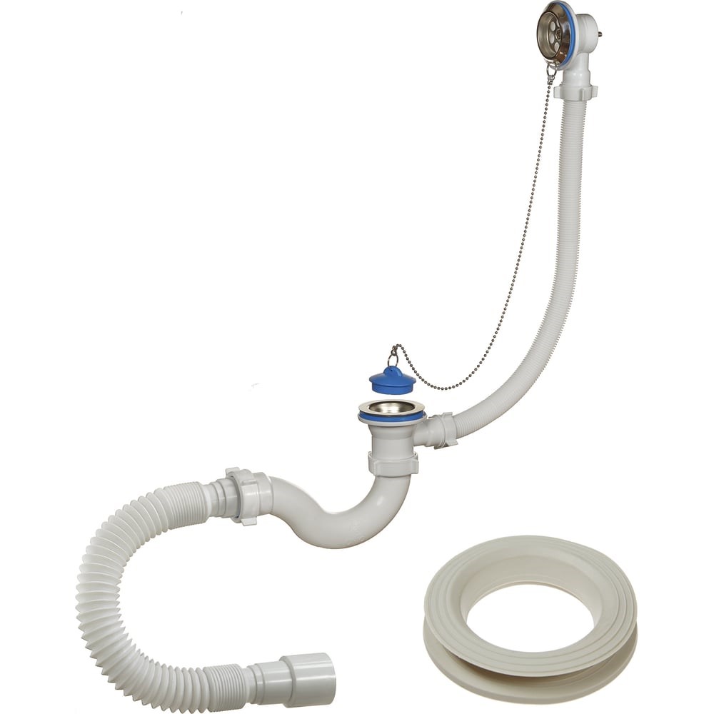 Сифон для ванны ORIO 1 1/2х40, с переливом и гибкой трубой 40-40/50 А-40089 для ванн и глубоких душевых поддонов. Конструкция сифона S-образная, прямоточная. В комплекте латунная цепочка с пробкой. Отвод в канализацию гибкая труба 40 – 40/50.