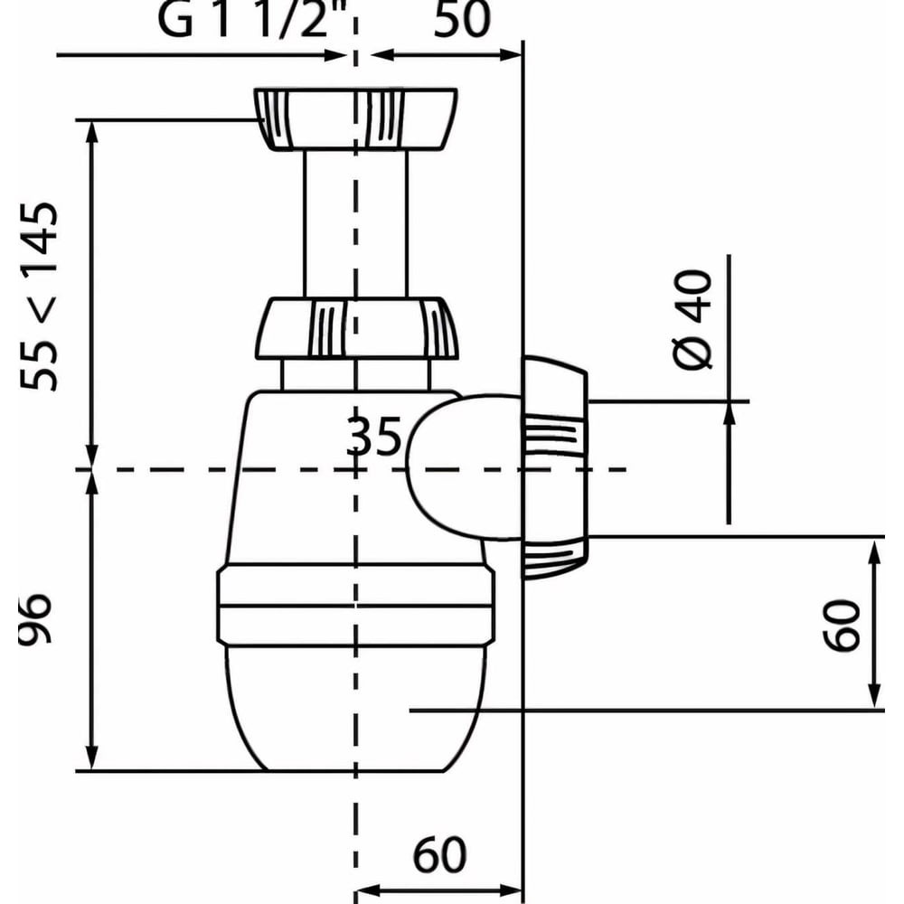 Сифон WIRQUIN Минор без выпуска 1½ х 40 мм предназначен для слива воды из мойки. Регулировка по высоте от 55 до 145 мм Гидрозатвор 60 мм Отверстие слива 1½" Скорость слива 36 л/мин Выход Ø 40 мм