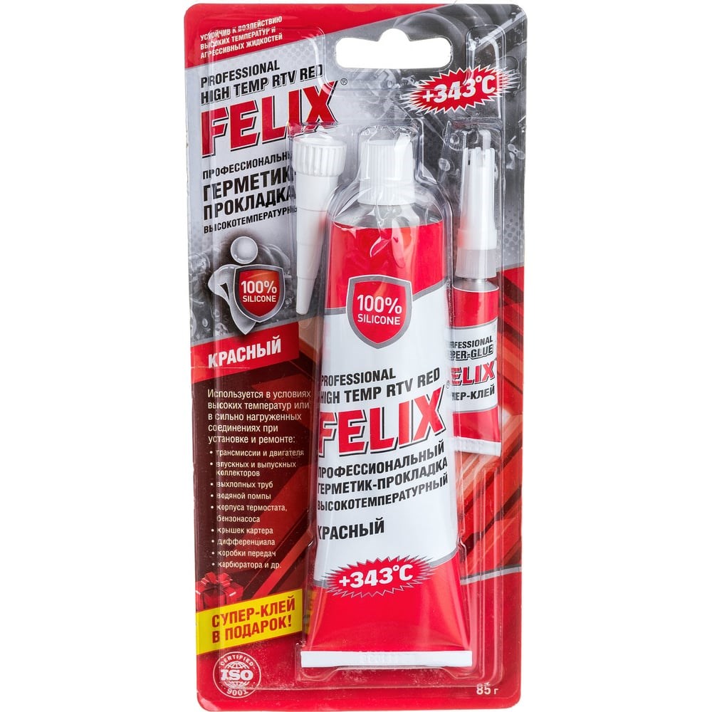 Герметик-прокладка FELIX (силиконовый; красный; 85 г) 411040057 применяется в условиях высоких температур или в сильно нагруженных соединениях, при проведении ремонта узлов и агрегатов трансмиссии и двигателя, при установке и ремонте впускных и выпускных коллекторов, выхлопных труб, водяной помпы, корпуса термостата, бензонасоса, крышек картера, дифференциала, коробки передач, карбюратора. Идеально подходит для устранения течи воды, антифриза и масла в разъемных соединениях (в картере, коробке передач, заднем мосте и т.п.), зазоров в строительных конструкциях.