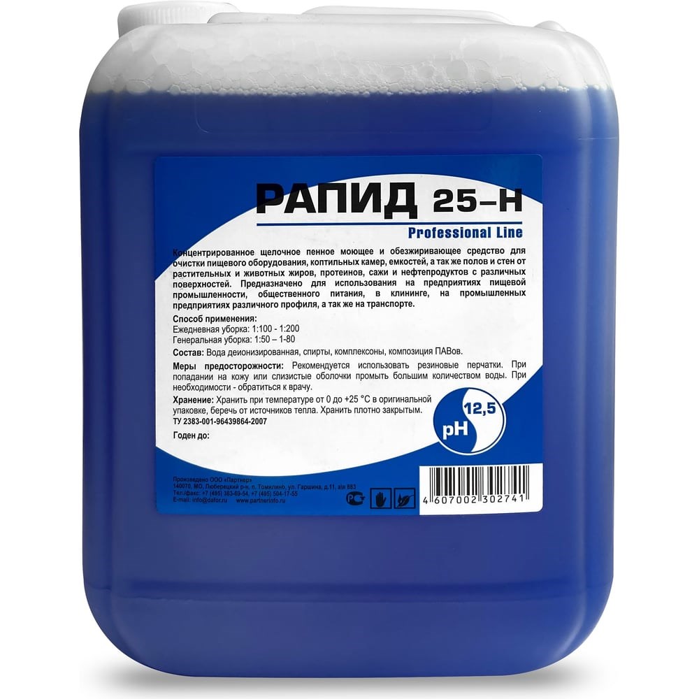 Концентрированное щелочное средство на водной основе Рапид 25-H используется для очистки и обезжиривания пищевого оборудования, коптильных камер, емкостей, а также полов и стен от растительных и животных жиров, протеинов, сажи и нефтепродуктов с различных поверхностей.Не повреждает моющие системы. Подходит для любых щелочестойких поверхностей.Способ примененияМойка производится как ручным, так и автоматическим способом.Ежедневная уборка: 1:100-1:150.Генеральная уборка: 1:30-1:50.