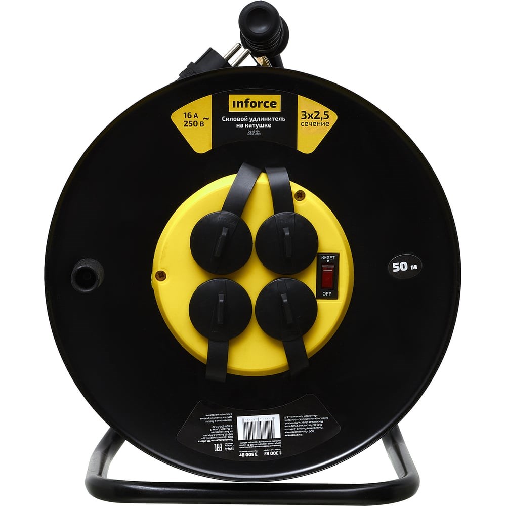 Силовой удлинитель на катушке Inforce 4 гнезда, с/з КГт 3х2,5 16A 50м IP44 GRANITE ZG 09-15-04 предназначен для использования в тяжелых условиях. Удлинитель можно применять на стройках, на производстве, а так же на открытом воздухе. Кабель изготовлен по ГОСТ 31223-2012. Морозостойкий кабель типа КГ с сечением 3х2,5 мм² обеспечивает долговечность и устойчивость к механическим повреждениям.  Металлическая катушка обеспечивает прочность и устойчивость конструкции. Удлинитель имеет степень защиты IP44 и может эксплуатироваться при температуре от -60 до +40°С. Защитные крышки на розетках предохраняют от попадания пыли и влаги, продлевая срок службы удлинителя. Термовыключатель добавляет дополнительный уровень безопасности, предотвращая перегрев. Заземляющий кабель защищает от поражения электрическим током.