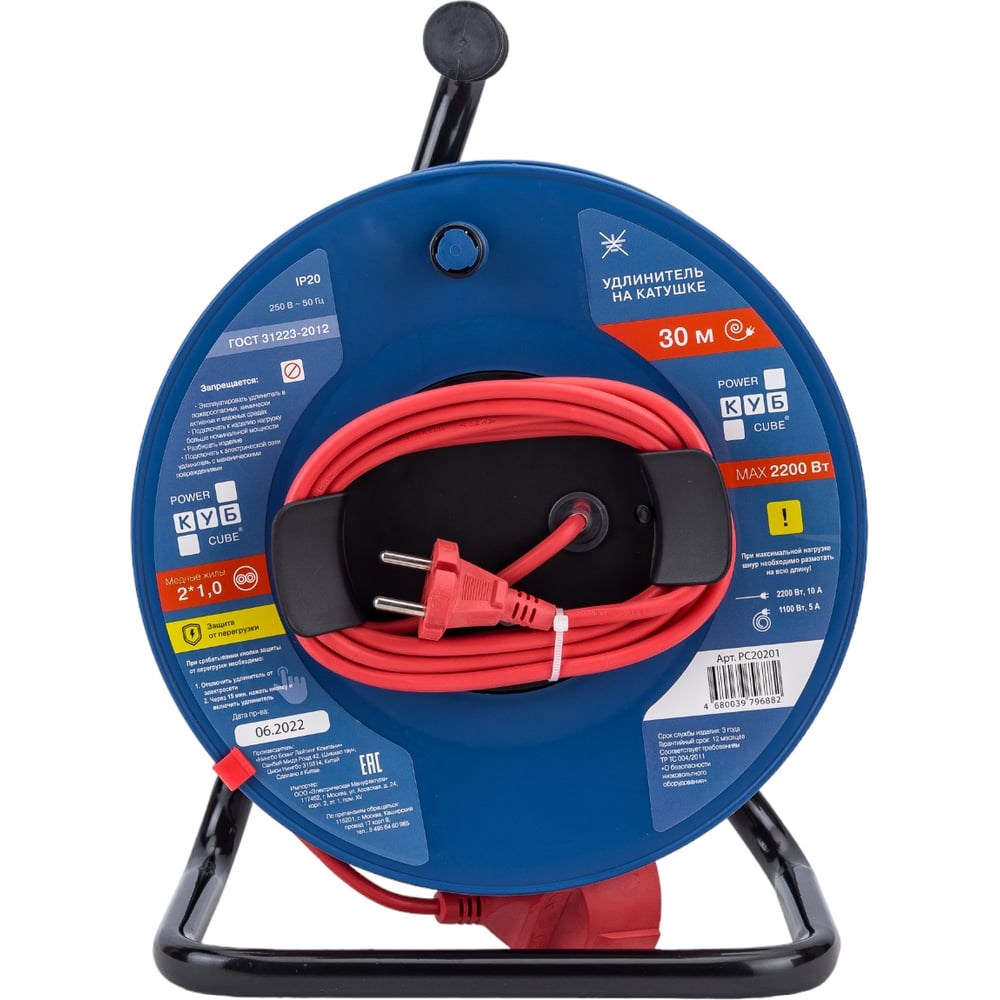 Удлинитель на катушке предназначен для подключения электроприборов различного назначения к электрической сети переменного тока, напряжением до 250В номинальной частоты 50Гц. Многоразовый автоматический предохранитель защитит от короткого замыкания и превышения максимально допустимой мощности. Качественный, мягкий провод изготовлен из кабельного поливинилхлорида, Литая вилка и розетка изготовлены из кабельного поливинилхлорида Цвет вилки, розетки и провода: красный. Яркий цвет, повышает заметность на рабочей поверхности. Удобная ручка для скручивания провода. Пластиковый барабан для намотки провода. Прочная металлическая стойка. Удобная ручка для переноски. Защитные шторки. Шторки блокируют доступ к токоведущим контактам других предметов. Прочная групповая упаковка изготовлена из картона. Позволяет надежно защитить товар от механического воздействия, деформации, порчи при транспортировке. Полное соответствие требованиям ГОСТ Произведено в России. Гарантия изготовителя 1 год.