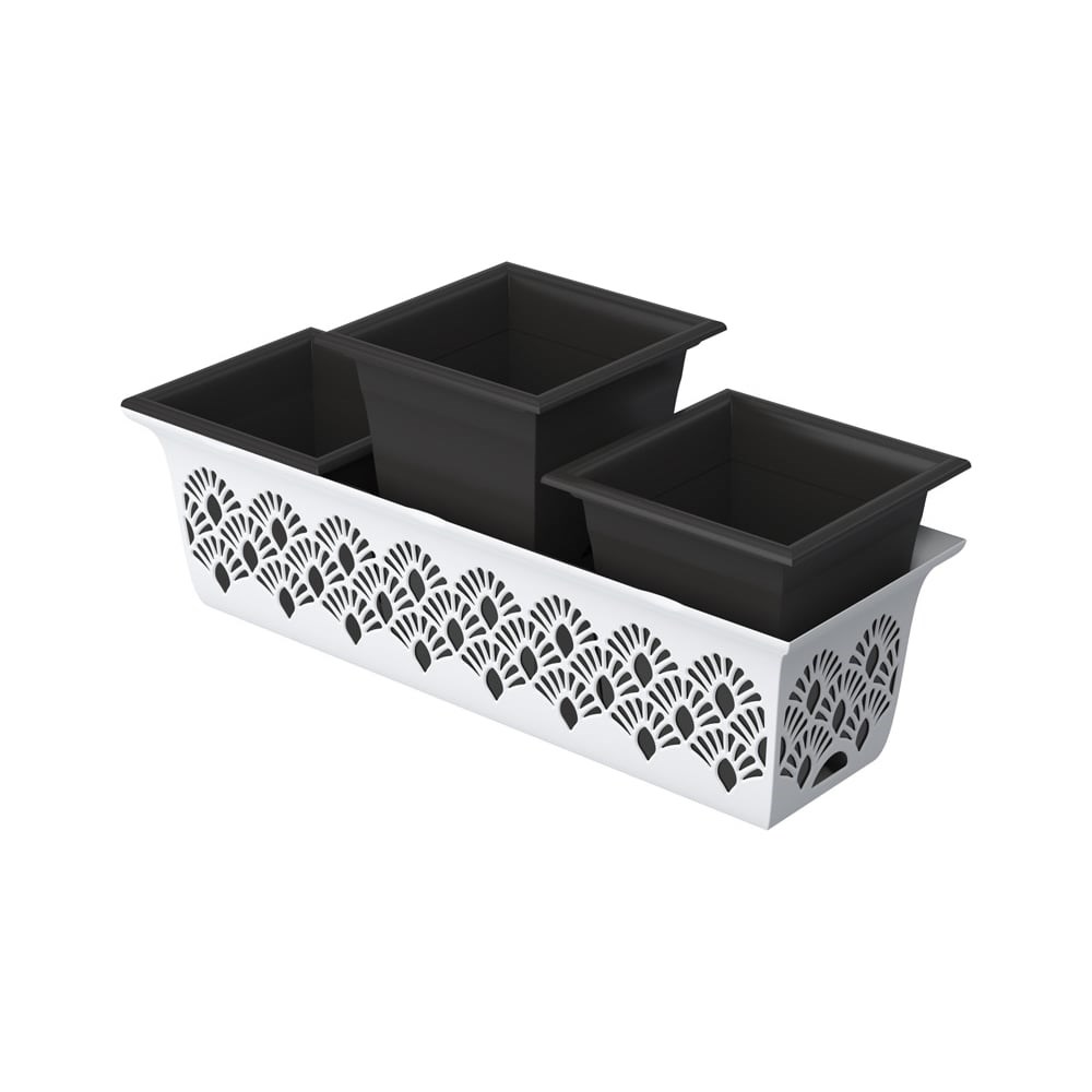Кашпо «Лотос» состоят из отдельных горшков для растений. Корневая система растения живёт в своём горшке, не соприкасается с другими растениями. Цветы легко переставить, повернуть к солнцу.У кашпо есть система прикорневого полива. В горшках есть отверстия, через которые растение впитывает воду и дышит. Просто залейте воду в отверстие сбоку.Материал: полипропилен Размер: 60×20×17,5см
