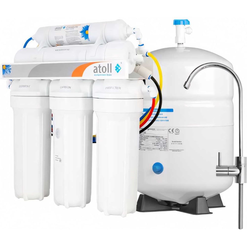 Атолл Патриот A-550 — это система обратного осмоса для очистки холодной воды. Процесс фильтрации на основе полупроницаемости полиамидной тонкопленочной мембраны исключает применение химических веществ. Вода проходит пять ступеней очистки отечественными фильтрующими элементами Атолл: МП-5В — картридж тонкой механической очистки 5 мкм. Задерживает частицы песка, грязи и прочие загрязнения более 5 мкм; GAC-10 Патриот — картридж из гранулированного активированного угля. Удаление из воды хлора, органических соединений, улучшение органолептических свойств воды; МП-1В — картридж тонкой механической очистки 1 мкм. Служит для удаления грязи и нерастворимых частиц крупнее 1 мкм. полиамидная тонкопленочная мембрана Атолл 1812-50. Производит очистку от примесей тяжелых металлов, солей жесткости, органических и неорганических соединений, бактерий и вирусов; постфильтр CK-2586C на основе порошкового активированного угля. Улучшает органолептические показатели воды. Префильтры и постфильтры необходимо заменять с периодичностью 1 раз в 6 месяцев, мембрану — 1 раз в 2 года. Срок службы элементов зависит от качества исходной воды. В комплект фильтра обратного осмоса Atoll A-550 Патриот также входят накопительный бак, монтажные принадлежности, кран, колбы для фильтров и ключ для их снятия.