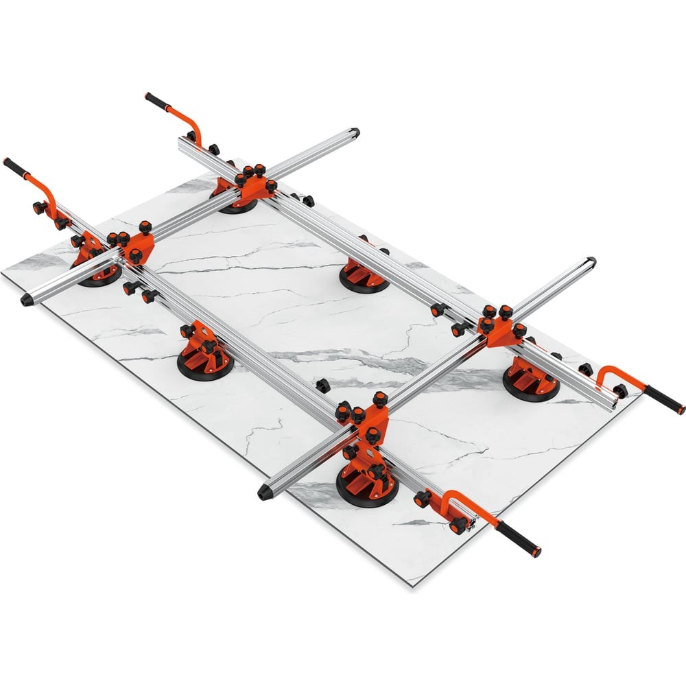 Данная система предназначена для глянцевой поверхности плиты. Для рельефной поверхности предназначена система TTOOLS EASY MOVE система переноски и монтажа крупноформатных плит c 6-аккумуляторными присосками.Система транспортировки TTOOLS EASY MOVE специально разработана для подъема, перемещения и монтажа крупноформатной плиткой. Предназначена для крупноформатного керамогранита максимальной длиной до 320см, шириной до 160см и весом до 200кг.Выполнена из 2 усиленных телескопических профилей из экструдированного алюминия, которые могут принимать различную форму и адаптироваться под разную плитку (длина направляющих от 165 до 320см) и двух поперечных штанг улучшающих прочность и стабильность системы, особенно при манипуляциях с тяжелой плитой. Для переноски плит небольшой ширины можно использовать только один профиль. Система имеет 4 ручки положение которых возможно изменять по всей длине профиля, адаптируя систему TTOOLS EASY MOVE под формат и форму керамогранита большого формата.Система переноски крупноформатного керамогранита TTOOLS EASY MOVE оснащена 6 вакуумными присосками диаметром 200 мм. Каждая присоска имеет датчик контроля вакуума. Положение присосок регулируется, что позволяет оператору установить их так, чтобы максимально безопасно и удобно работать с плитой.