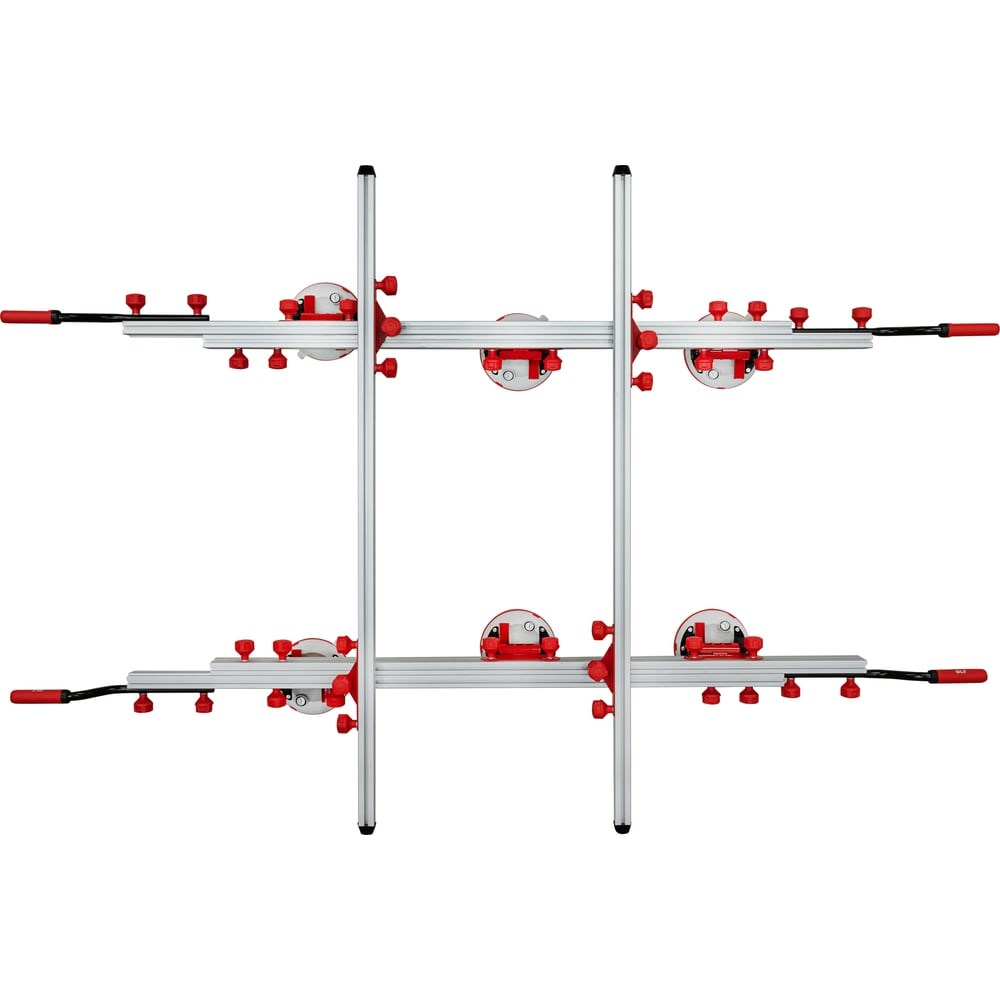 Система переноски крупноформатного керамогранита DLT специально разработана для подъёма, перемещения и укладки крупноформатной плитки, максимальной длиной до 320см, шириной до 160см и весом до 500кг. В комплекте с переноской поставляется качественная сумка-кейс на колесиках для удобного хранения и транспортировки. Переноска оснащена шестью вакуумными 8 дюймовыми электрическими присосками DLT с АВТО подкачкой для гладкой и структурной плитки (работают даже на агрессивном рельефе) в белом цвете основания чаши что предотвращает возможное появление черных пятен на используемой поверхности. Присоски имеют встроенный электрический насос, датчик давления (анализирует силу разрежения воздуха и автоматически включает насос, когда требуется восстановить необходимые параметры вакуума) и манометром давления для визуального контроля. Каждая присоска может удержать груз до 140кг. Положение присосок регулируется, что позволяет пользователю установить их так, чтобы максимально безопасно и удобно манипулировать заготовкой. Эта система «два в одном»: присоски снимаются и ими можно пользоваться отдельно для ручной переноски и укладки плитки. Переноска состоит из продольных телескопических профилей из экструдированного алюминия которые могут принимать различную форму и адаптироваться под разную плитку (регулируются по длиннее от 165 до 320см, по ширине от 0,5 до 1,6м.) и двух поперечных штанг улучшающих прочность и стабильность системы, особенно при манипуляциях с тяжёлой плитой (в комплекте 2 пары разного размера). Для переноски плит небольшой ширины можно использовать только одну продольную направляющую. Система имеет 4 рукоятки (по 2 на направляющую) положение которых возможно изменять по всей длине профиля, адаптируя переноску DLT под формат и форму керамогранита большого формата. Переноска имеет невысокий вес - всего 30 кг. Вес одного продольного телескопического профиля в сборе с присосками составляет 13.5 кг.