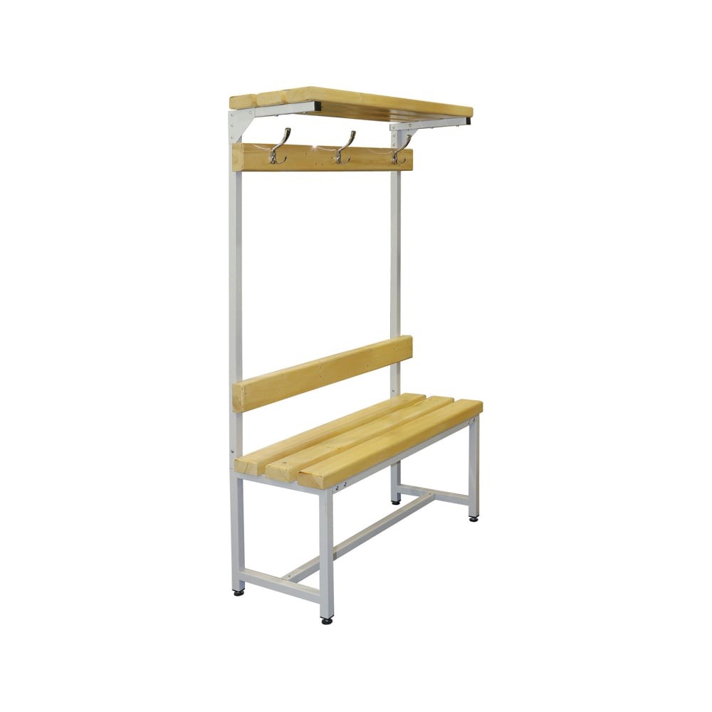 Каркас — из крепкого стального прямоугольного профиля 30х30 мм. Окрашен порошковой краской RAL 7035.Очень прочные и долговечные скамейки для раздевалок со спинкой, вешалкой и полкой. Все элементы скамеек отличаются надёжностью, скамьи практичны и неприхотливы в эксплуатации. Полимерное защитно-декоративное покрытие, особо прочное, коррозионно-стойкое, устойчиво к перепадам температуры. Сиденье скамьи — три массивные доски (древесина хвойных пород толщиной 30 мм), пропитанные антисептиком и покрытые водостойким лаком. Скамейка снабжена спинкой, вешалкой и верхней полкой, стойка к влаге, и большим нагрузкам, что обусловливает широкий диапазон условий её использования. Скамья — разборная, конструкционные элементы её скрепляются с помощью винтов и стяжек М6. На неровной поверхности скамья легко выставляется ровно благодаря возможности плавной регулировки ножек по высоте.
