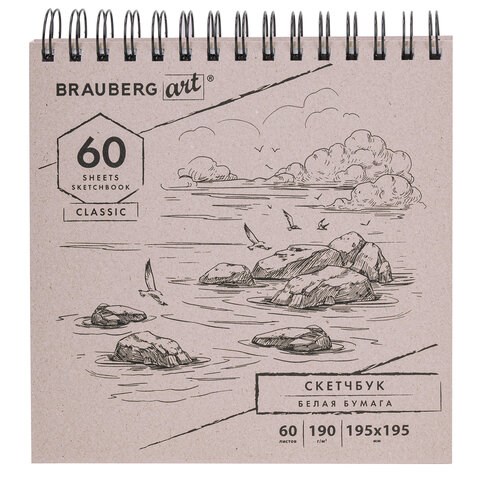 Скетчбук, белая бумага 190 г/м2, 195х195 мм, 60 л., гребень, твердая обложка, BRAUBERG ART CLASSIC, 113852