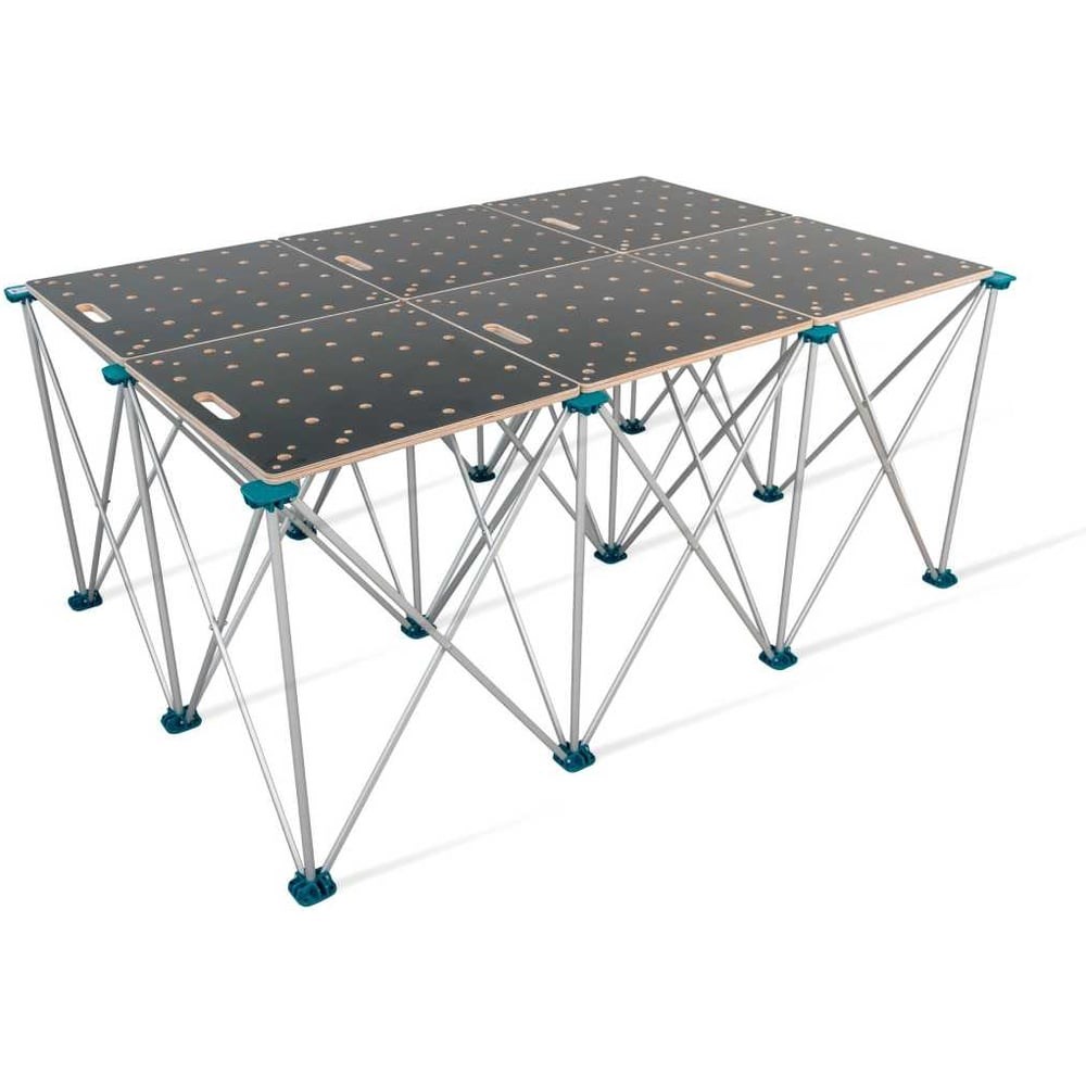 Столы Q4 Ant – это удобная организация рабочего места. Стол Ant используется на строительных объектах и в быту, в гараже и на даче. Может использоваться для выполнения столярных, слесарных, сборочных, раскроечных, малярных, упаковочных и любых других видов работ. Можно использовать как стол - верстак - подмости.Подстолье имеет комфортную высоту 90см. Состоит из 6 столешниц и подстолья, состоящего из вертикально расположенных опорных стоек, работающих по принципу телескопа. Стойки стола изготовлены из анодированного алюминиевого профиля. Опоры - из полиамида, самого ударопрочного пластика, стойкого к истиранию и позволяющего выдерживать высокую нагрузку. * Столешницы: с перфорацией, изготовлены из влагостойкой ламинированной фанеры 18 мм. Диаметр отверстий в столешнице 22 мм и 20мм, расположены в шахматном порядке.Особенностью стола является его модульность. Конструкция позволяет быстро собирать различные конфигурации повышенной прочности и жёсткости. Одна секция стола 600х600 мм выдерживает равномерно распределенную нагрузку до 300 кг. Рекомендованная нагрузка при конфигурации стола 3х4 - 1800 кг на весь стол.