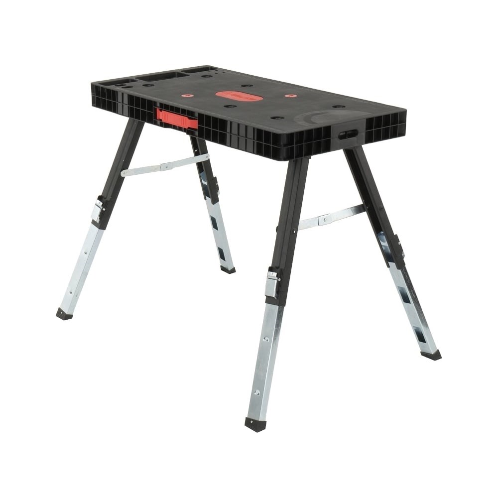 Универсальный верстак с рабочим столом имеет возможность регулировки высоты на 520мм, 660мм, 800мм. Стальные ножки отличаются особой прочностью. Рабочая нагрузка на верстак 150кг. Размеры площадки: 940 мм х 480 мм. Верстак оснащен угломером, линейкой и лотком для инструментов.