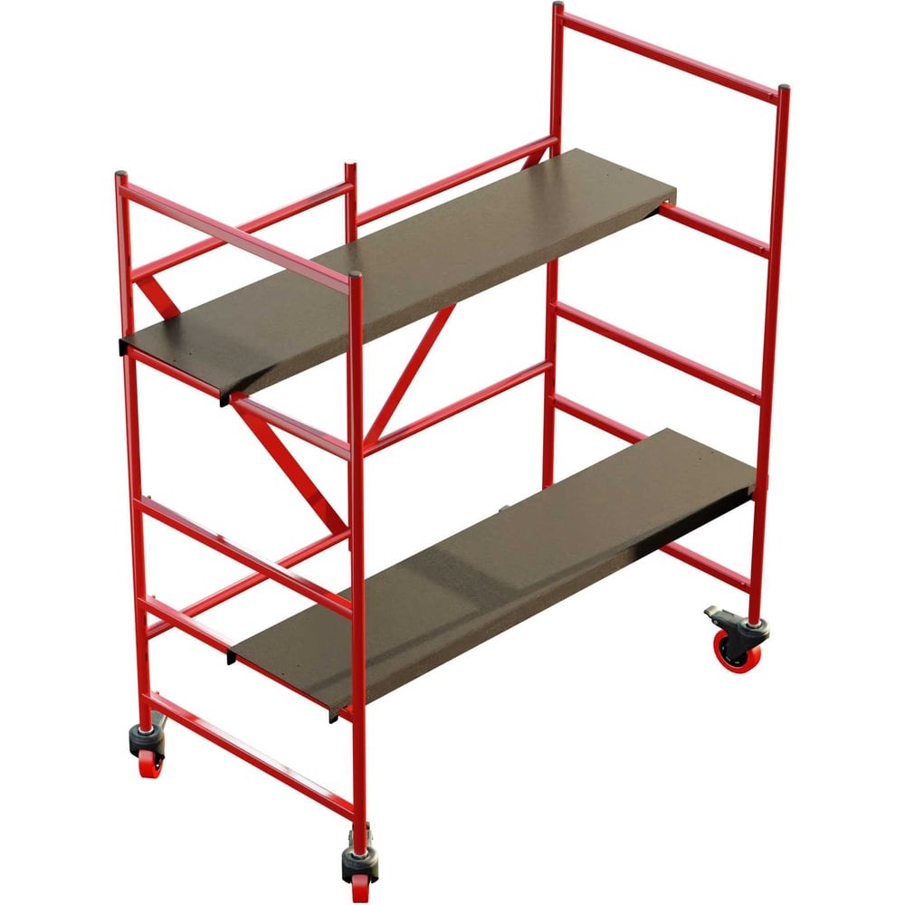 Складные строительные леса предназначены для выполнения строительно-монтажных, ремонтно-отделочных работ внутри и снаружи помещений. Конструкция полностью выполнена из стали и при этом имеет достаточно легкий вес (менее 32 кг), что позволяет ее переносить одному человеку. Ширина конструкции (56 см) обеспечивает доступ в любой дверной проем. Для удобства перемещения лесов на ножках установлены транспортировочные колеса со стопорами. Опоры надежно фиксируются на раме фиксаторами. Они могут быть установлены на высоту 40, 60, 90, 120 см. В рабочем положении длина всей конструкции составляет чуть более 1 метра, а максимальная нагрузка на каждую опору составляет 180 кг, что позволяет мастеру размещаться на опоре вместе с инструментом. Противоскользящее покрытие площадок сделает работу максимально комфортной и безопасной. Легко складываются в компактное положение для хранения и транспортировки. Подмости станут незаменимым помощником при малярных, штукатурных, отделочных и других ремонтных работах на высоте в жилых и нежилых помещениях.
