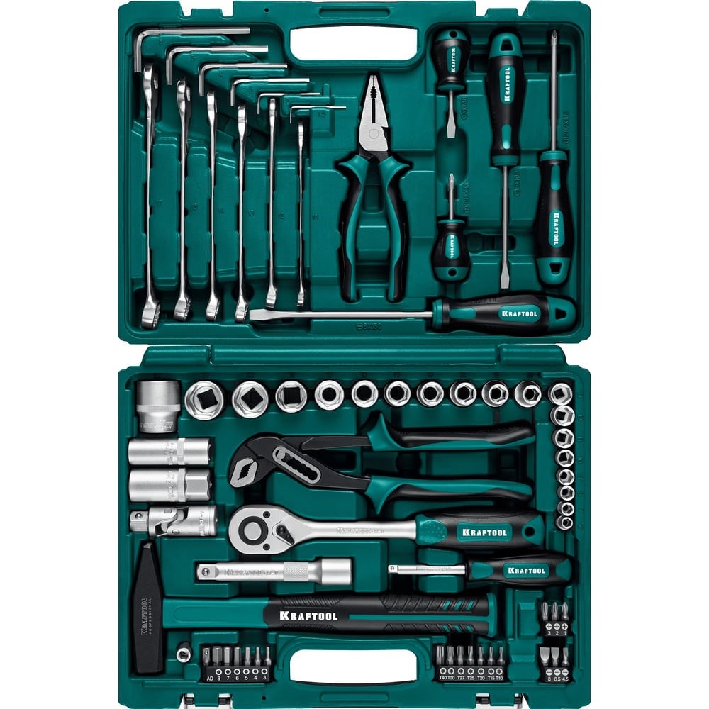 KRAFTOOL Extrem-66 66 предм., (1/2"+1/4"), универсальный набор инструмента 27976-H66_z01 - это профессиональный комплект из 66 предметов для индустриального применения. Инструменты сделаны из хромованадиевой стали и имеют хромированное покрытие, защищающее от коррозии. Снабжен профилем SUPER-LOCK для переноса пятен контактов с углов граней крепежа к их центру.