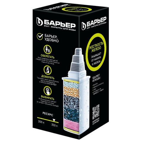 Сменная кассета для фильтра БАРЬЕР Жесткость Железо работает комплексно: снижает жесткость, которую мы привыкли встречать в жизни в виде накипи, удаляет из воды растворенное железо и неприятный металлический привкус, а также, как и все кассеты БАРЬЕР, очищает от хлора, тяжелых металлов и других вредных примесей. Результат – чистая вода без накипи, рыжеватого осадка и неприятного привкуса. Ресурс кассеты — 350 литров.