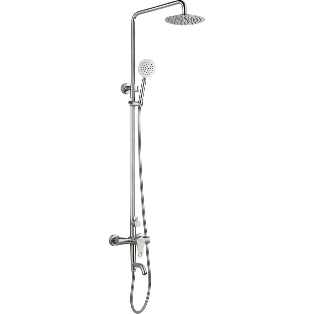 Смеситель для ванны и душа с регулируемой высотой штанги и лейкой "Тропический дождь" Эволюция техники привела к тому, что душ из гигиенического приспособления превратился в средство для релаксации. Это повысило требования к комфортности его использования, базовой функциональности и внешнему виду. Душевая система – тщательно продуманный набор, подходящий для ванны или кабинки, способный стать центральным элементом санузла. Характеристики:Материал: нержавеющая сталь;Излив поворотный на 180 градусовФорма верхнего душа: круглая;Форма лейки: круглая;Тип струи: тропический дождь;Длина шланга: 150 смМонтаж: настенный;