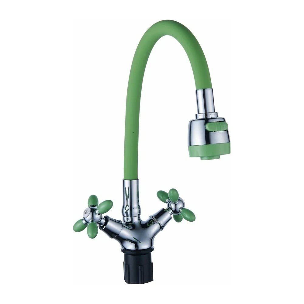 Смеситель для кухни АНТЕЙ®, серия Радуга - Цвет: хром + зеленый - Кран-букса: 1/2" дюйма 20 шлиц, латунная с керамическими пластинами, угол поворота 90° - Излив: высокий, поворотный, силиконовый, гибкий - Высота (корпус + излив): 327 мм - Аэратор: 2-х режимный, переключение реж. (душ/поток) кнопкой, пластиковый, съемный В комплекте: гибкая подводка ½ дюйма 350 мм – 2 шт., монтажный комплект – гайка