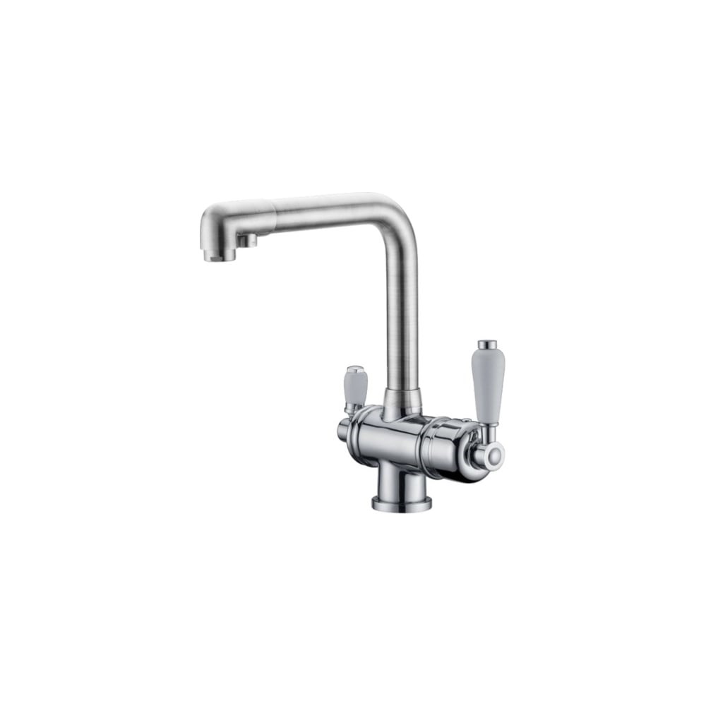 Смеситель для кухни под фильтр ELGHANSA Terrakotta 56A5740Высококачественный смеситель для кухни, выполнен из сантехнической латуниВ комплектеСмеситель с поворотным изливомПереходник для шланга фильтранабор крепежа для установки смесителя2 гибких подводки водыОсновные характеристикиДлина излива - 21 смВысота излива 22 смМатериал ручки переключения - Металл,Способ крепления к раковине или столешнице - ШпилькаКартридж по технологии LongLife рассчитанный до 500 000 тыс цикловПодключение фильтра питьевой воды - ДаСмеситель для кухни с фильтром - это необходимый элемент современного дома, который обеспечивает удобство и безопасность при наборе питьевой воды. Такой смеситель позволяет получать чистую и свежую воду прямо из крана, что делает его незаменимым помощником на кухне, а надежное металлическое цанговое крепление шланга от фильтра вместо обычного пластикового элемента, добавит надежности всей системы.Одним из основных преимуществ смесителя для кухни с фильтром является возможность прямого подключения к фильтру для очистки воды который очищает воду от хлора, механических примесей, микроорганизмов и тяжелых металлов, делая воду безопасной для питья и использования в приготовлении пищи.Наличие крана для фильтра питьевой воды позволяет экономить время и деньги на покупке бутилированной воды или установке дополнительного крана для фильтра.
