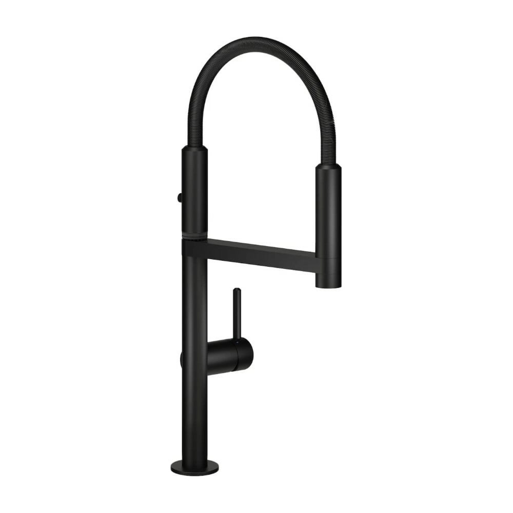 Смеситель для кухни Nobili MOVE матовый черный MV92300/50BM 00000106809 дополнительные характеристики: Ограничитель мощности с открытием в холодной воде Ограничитель напора с торможением на 50% Шарнирный излив с поворотом на 360° Аэратор против известковых отложений M 24 x 1 Одноструйный душ, поворачивающийся на 360° с магнитной подставкой