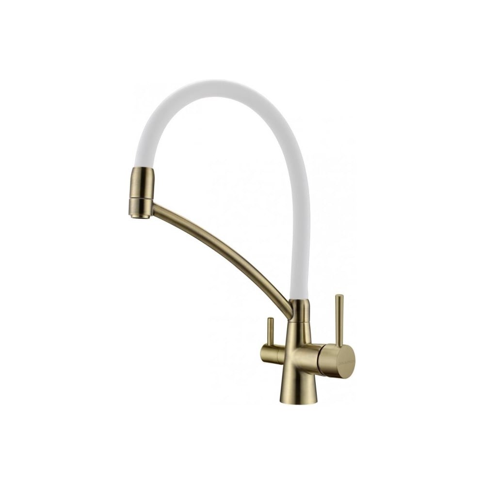 Смеситель для кухни Paulmark Sigen бронза, белый шланг, резиновый излив Si213111-BRw изготовлен из прочной и надежной латуни. Латунь не подвержена коррозии, поэтому смеситель прослужит много лет. Смеситель оснащен гибким изливом, который удобен для чистки и ополаскивании раковины, а также для наполнения водой больших емкостей. Модель является практичной: позволяет подключить фильтр для воды без дополнительных отверстий в мойке. Очищенная вода поступает по отдельному каналу и не смешивается с водопроводной.