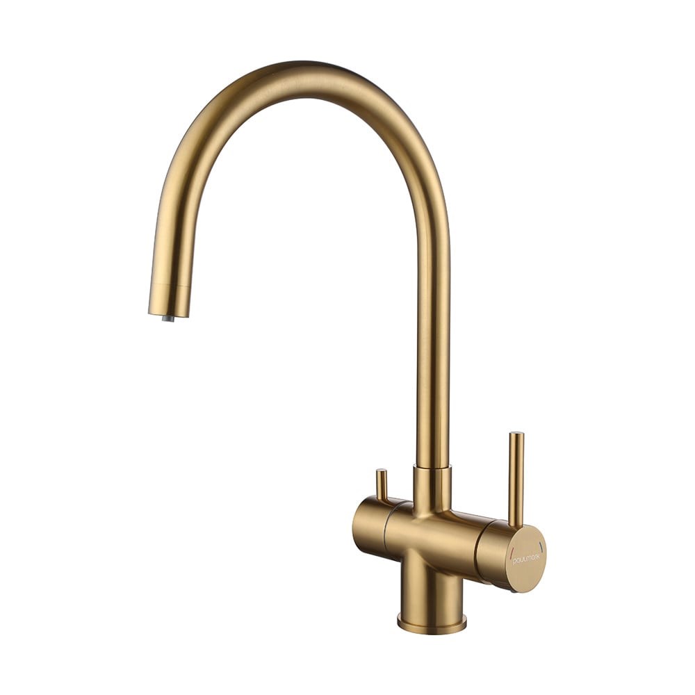 Смеситель для кухни Heller He213218-BG с возможностью подключения фильтра питьевой воды. Изготовлен из высококачественной и экологически чистой нержавеющей стали AISI 304, легированной никелем, марганцем, медью и хромом, что обеспечивает ей повышенную прочность и устойчивость в коррозионных средах. Водопроводная вода и питьевая подаются из одного аэратора. Включение питьевой воды осуществляется отдельной ручкой. В конструкции использован картридж Sedal с керамическими пластинами. Цвет BG имеет дополнительное защитное покрытие PVD, устойчивое к появлению царапин и истиранию. Комплектация включает в себя запасной пластиковый аэратор, а так же комплект гибкой подводки длинной 60 см, крепление с облегченной установкой (гайка на втулке). Гарантийный срок на смеситель Paulmark 5 лет